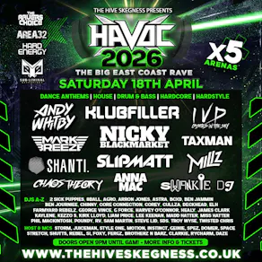 Back for its 5th massive year, Havoc has grown from a bold idea by the sea into what's now hailed as the one of the UK's must visit events. What started as a seaside gathering has exploded into one of the country's biggest multi-genre all-night Raves, bringing thousands of ravers to Skegness year after year.