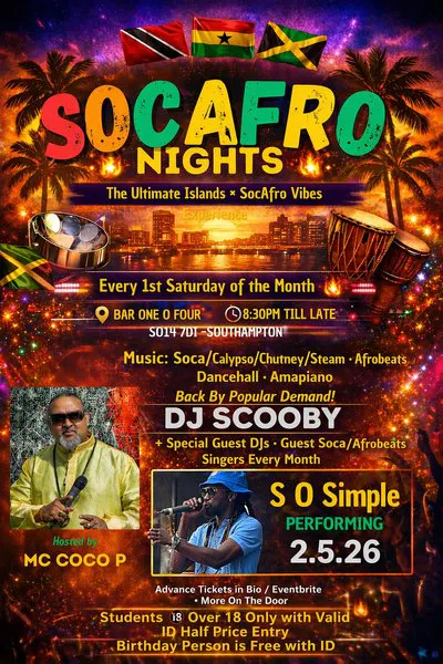 Step into the rhythm of SocAfro Music Nights, a unique celebration of sound, culture, and connection. Blending the infectious energy of Soca with the smooth, vibrant pulse of Afrobeats, this is more than just a party—it’s a musical journey across continents.