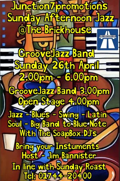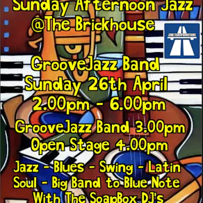 The Brickhouse is open from 12.30pm for Sunday Service - The SoapBox DJ's play 100% Vinyl from 2,00pm as Jim & Band set their stall out - The GrooveJazz Band Showtime is 3.00pm with a short interval then 4.00pm it's an open stage so bring your instruments, tap Jim up with about 3 music selections preferably standards that you wish to perform...