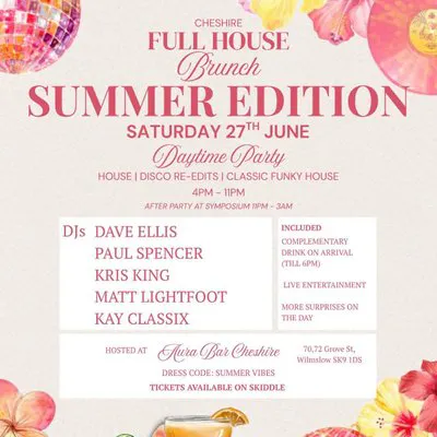 Set in the stunning Aura Bar, Wilmslow. This is the 3rd instalment of the Cheshire Full House Brunch. The last 2 events saw a sold out venue, enjoying 2 rooms of incredible house music. Expect glamour, smiles and a party to rival the best of parties. Doors open at 16:00 with last entry at 18:00, no exceptions! Bring your smile and your glamorous summer outfit, plus a nice pair of shades to enjoy Kay Classix on the open roofed terrace. A real day of class and fun.