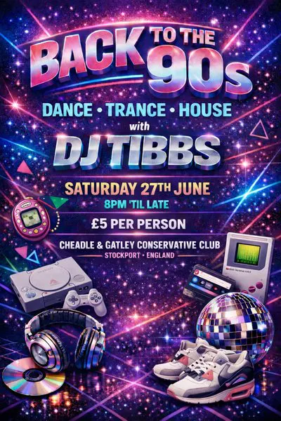 Come and relive the decade of unforgettable dance anthems! Join DJ Tibbs for a feel-good night of classic 90s hits, from early floor-fillers to the big late-night tunes that bring everyone together. Expect sing along choruses, uplifting piano hooks, and the kind of tracks that instantly take you back. Whether you’re out for a proper dance, a catch-up with friends, or just want great music with a friendly atmosphere, this is your night. Dress up if you fancy it, bring your mates, and let’s make it a 90s night to remember.