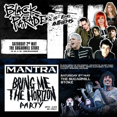Black Parade - 00's Emo Anthems is coming to The Sugarmill Stoke on Saturday 2nd May for a huge emo party! With Mantra - Bring Me The Horizon Party in the second room! Bank Holiday weekend party!