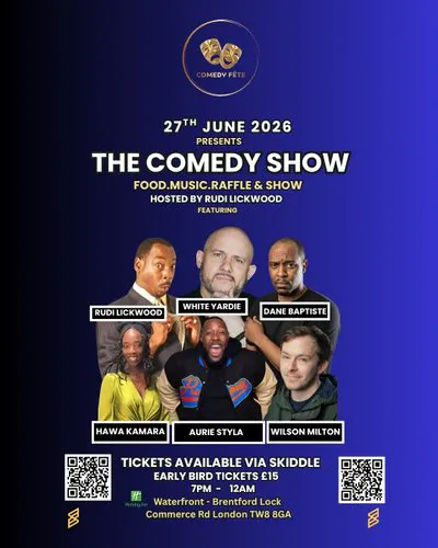 We have a bumper of a summer extravaganza comedy experience ready for you & this heat induced line up with White Yardie, Aurie Styla, Hawa Kamara, Wilson Milton, Dane Baptiste & hosted by comedy royalty Rudi Lickwood with Caribbean food on sale from West London locals Ochi complimenting a night of laughter, music & prizes all inside the plush surroundings of the Waterfront - Brentford Lock. This will be a sizzling start to a beautiful summer you won't want to miss!