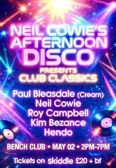 Neil Cowie's Afternoon Disco brings you a very special bank holiday event, Headlined by non other than Cream Resident Paul Bleasdale with an Afternoon of Floor Filling Club Classics from the 90's 00's & more.