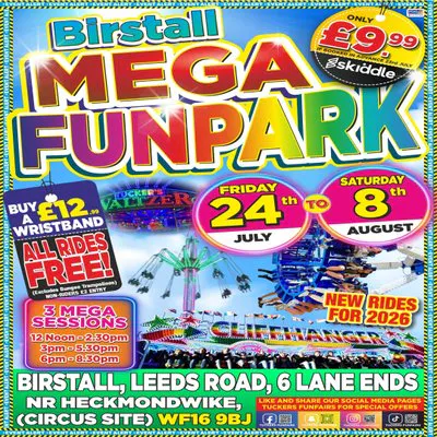 The Fun Fair will take place at 6 Lane Ends, Leeds Road near Heckmondwike from Friday 24th July to Saturday 8th August with lots of rides and attractions including amazing thrill rides such as the Aviator observation ride, G Force 'The Ride', family rides such as the Dodgems and Sizzler Twist will be on offer too as well as Stratos Fear an exciting outward facing white knuckle attraction as well as a family Rollercoaster!
