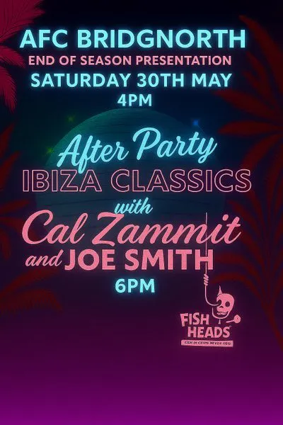 Join AFC Bridgnorth celebrating their season in style with their exclusive Ibiza Classics after party. Hosted by Cal Zammit and Joe Smith