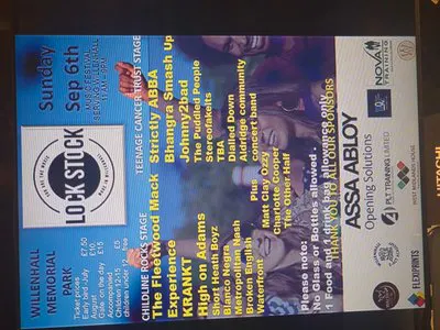 Willenhall Lock Stock is a not for profit community music festival. 2 arenas and stages with over 3000 attending . Food and drink concessions plusfree parking inside the Park . A small personal allowance of food and drink permitted on entry. Approx 4x500ml or 4 cans . a bag will be issued on entry with ticket. Food limited to A3 bags per person.
