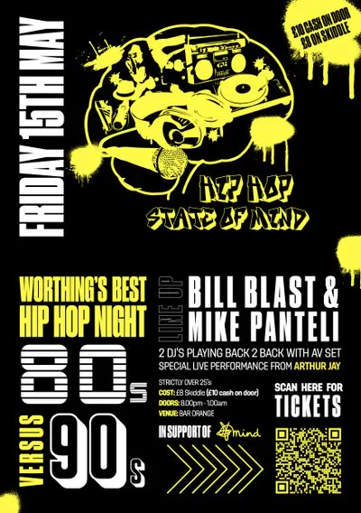 Hip Hop 'State of Mind' is the best and only over 25's hip hop night in Worthing. The them is 80's vs 90's and have two of the best on the decks; Bill Blast and Mike Panteli who will be collaborating together with visuals.