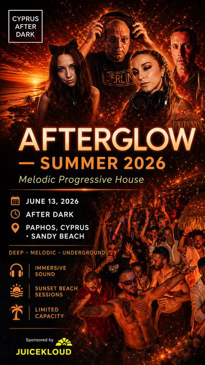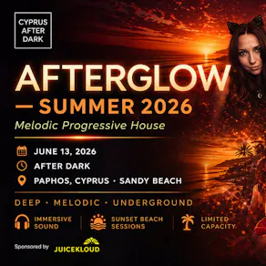 AFTERGLOW is an open-air melodic progressive house event set on the coastline of Sandy Beach, Paphos, Cyprus.