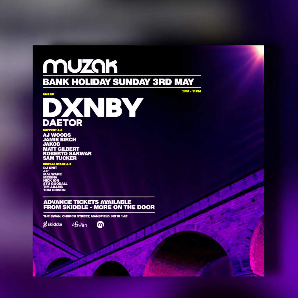 MUZAK Bank Holiday 24th May with headliners Funk Cartel + More... A day rave under the iconic railway arches in the heart of Mansfield